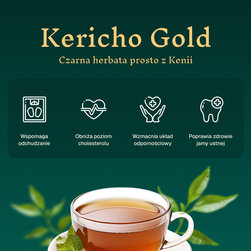 Jakość czarnej herbaty zależy od liczby zbieranych młodych liści, sposobu zbioru i ich pielęgnacji. Czarna herbata Kericho Gold ma wyraźny jasny kolor i aromatyczny smak, dzięki bogatej wulkanicznej glebie i położeniu plantacji w strefie równikowej. Herbata Kericho Gold jest wolna od pestycydów.