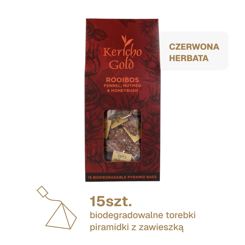 Czerwona herbata | Rooibos Fennel, Nutmeg & Honeybush to mieszanka rośliny roiboos z kwiatowym lekko palonym smakiem krzewu miodowego, kopru włoskiego i pikantnej gałki muszkatołowej tworząc orzeźwiający napar ziołowy.